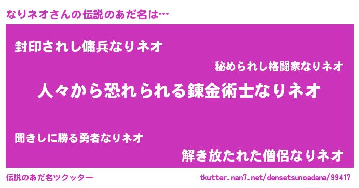 | 男性向けラノベタイトル風あだ名 | 『おまえをオタクにしてやるから、俺をなりネオにしてくれ! 』 |
