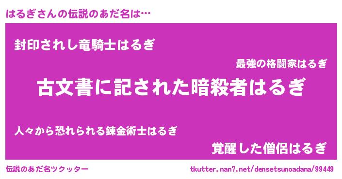 | 男性向けラノベタイトル風あだ名 | 『はるぎに滅ぼされるだけの簡単なお仕事です』 |