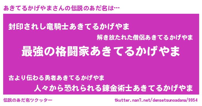 | 男性向けラノベタイトル風あだ名 | 『あきてるかげやまに滅ぼされるだけの簡単なお仕事です』 |