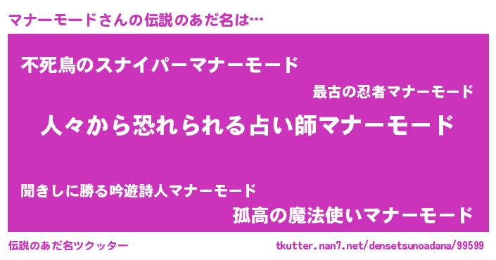 | 男性向けラノベタイトル風あだ名 | 『おまえをオタクにしてやるから、俺をマナーモードにしてくれ! 』 |