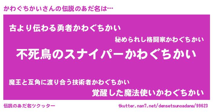 | 胡散臭い通販商品みたいなあだ名 | 『モテモテ間違いなし霊験あらたかなお札…その名も「かわぐちかい」』 |