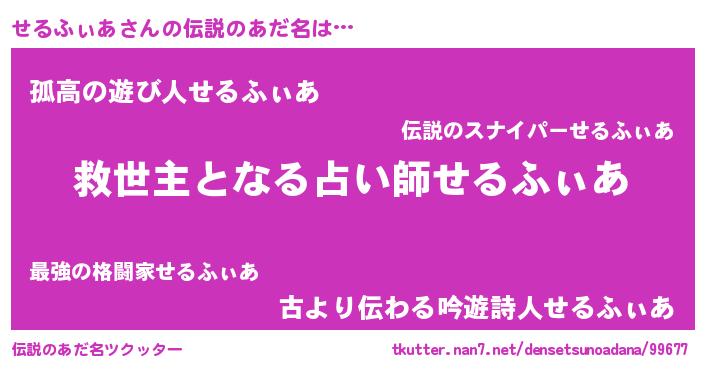 | ヒーロー風カッコイイあだ名 | 『慈愛の使者せるふぃあ』『仮面セルダー』 |