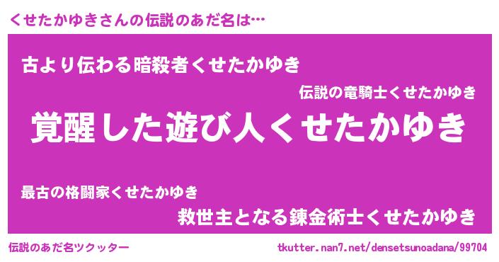 | 男性向けラノベタイトル風あだ名 | 『くせたかゆきの嫁は女の子じゃないと思った?』 |