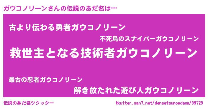 | 男性向けラノベタイトル風あだ名 | 『ガウコノリーンに滅ぼされるだけの簡単なお仕事です』 |
