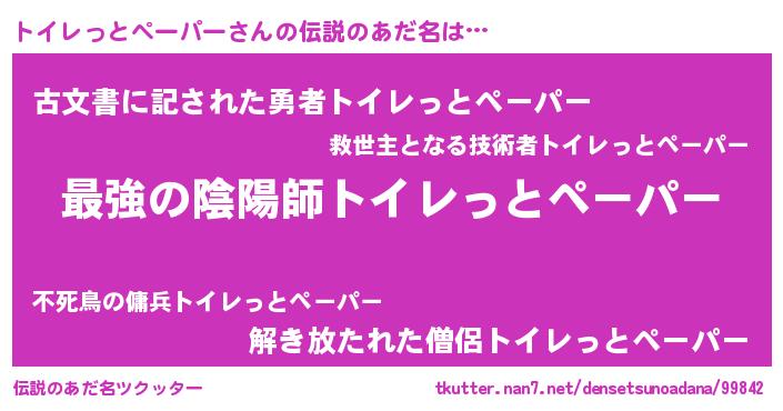 | 胡散臭い通販商品みたいなあだ名 | 『あなたにだけ特別に提供する世界で10本だけ現存している希少なブランデー…その名も「トイレっとペーパー」』 |