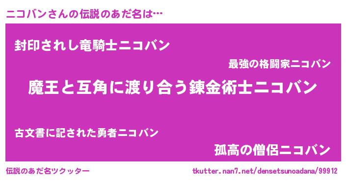 | ヒーロー風カッコイイあだ名 | 『サイバー戦士ニコバン』『仮面ニコダー』 |