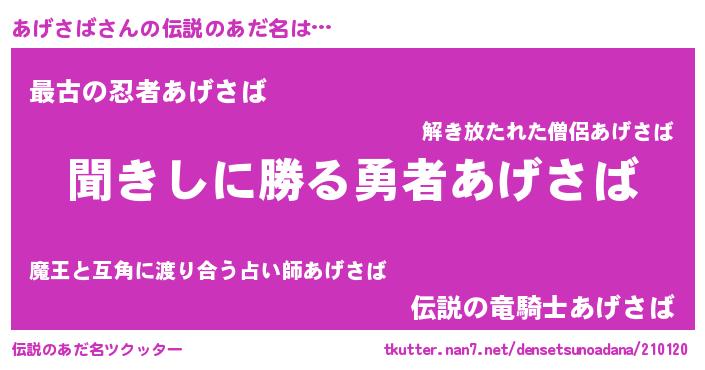| 意味不明あだ名 | 『永久保存あげさば』『自称あげさば』 |