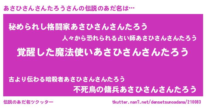 | 男性向けラノベタイトル風あだ名 | 『あさひさんさんたろうの嫁は女の子じゃないと思った?』 |