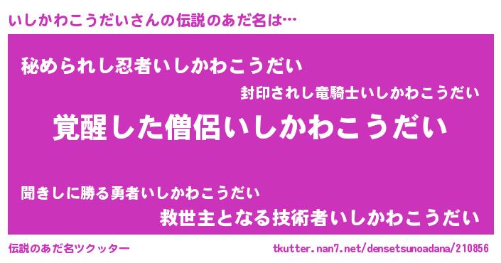 | 男性向けラノベタイトル風あだ名 | 『いしかわこうだいの嫁は女の子じゃないと思った?』 |