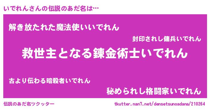 | 男性向けラノベタイトル風あだ名 | 『Re:いでれんから始める異世界生活』 |