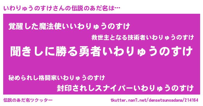 | 男性向けラノベタイトル風あだ名 | 『いわりゅうのすけという概念が存在しない退屈な世界 』 |