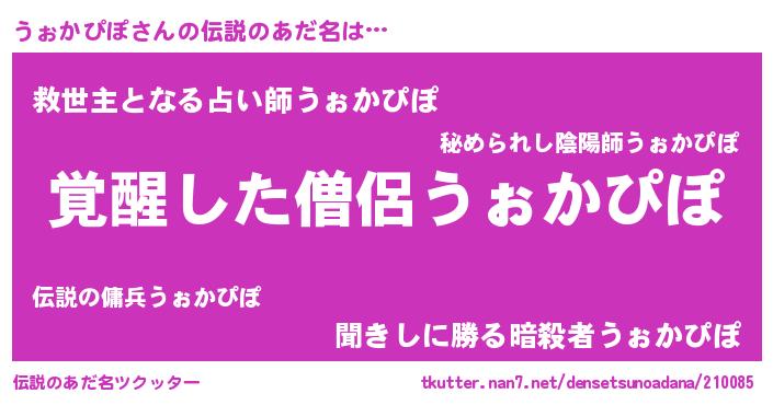 | 男性向けラノベタイトル風あだ名 | 『うぉかぴぽ~年齢イコール彼女いない歴の魔法使い~』 |