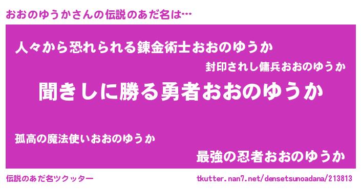 | ヒーロー風カッコイイあだ名 | 『ネオオオノユウカ』『仮面オオダー』 |