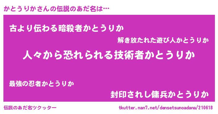 | 男性向けラノベタイトル風あだ名 | 『おまえをオタクにしてやるから、俺をかとうりかにしてくれ! 』 |
