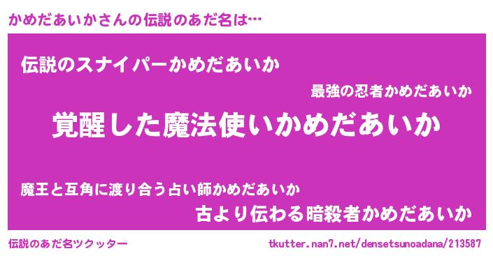 | 意味不明あだ名 | 『とにかく怪しいかめだあいか』 |