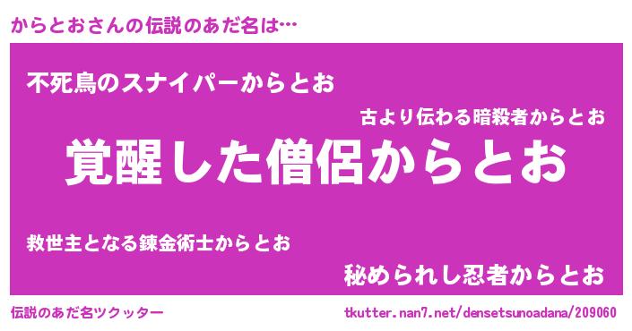 | 意味不明あだ名 | 『自称からとお』『ヨモギ科からとお属』 |