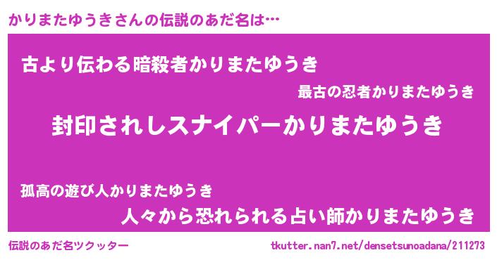 | 胡散臭い通販商品みたいなあだ名 | 『億万長者になれる霊験あらたかなお札…その名も「かりまたゆうき」』 |
