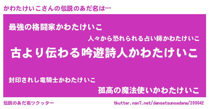 | ヒーロー風カッコイイあだ名 | 『ネオカワタケイコ』『仮面カワダー』 |
