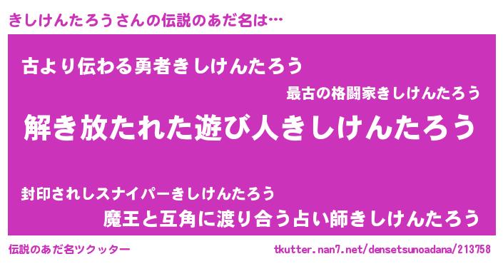 | 男性向けラノベタイトル風あだ名 | 『きしけんたろうの嫁は女の子じゃないと思った?』 |