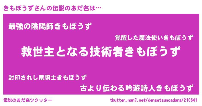 | 男性向けラノベタイトル風あだ名 | 『きもぼうずに滅ぼされるだけの簡単なお仕事です』 |