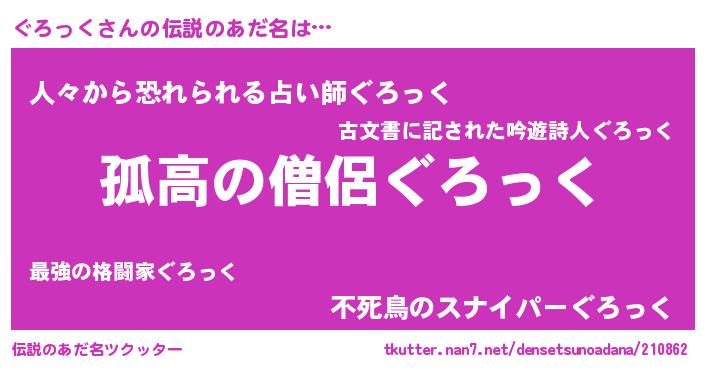 | 男性向けラノベタイトル風あだ名 | 『ダンジョンにぐろっくを求めるのは間違っているだろうか』 |