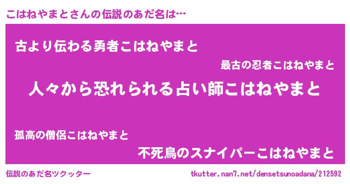 | 男性向けラノベタイトル風あだ名 | 『おまえをオタクにしてやるから、俺をこはねやまとにしてくれ! 』 |