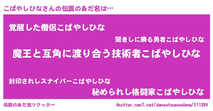 | ヒーロー風カッコイイあだ名 | 『愛の使者こばやしひな』『炎刃騎士コバ』 |
