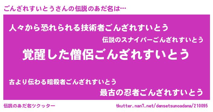 | 女子向けラノベタイトル風あだ名 | 『ごんざれすいとう様がみてる』 |