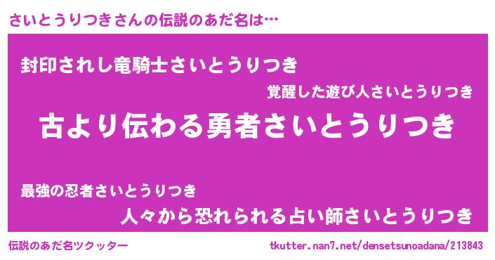 | ヒーロー風カッコイイあだ名 | 『ネオサイトウリツキ』『黄金騎士サイ』 |