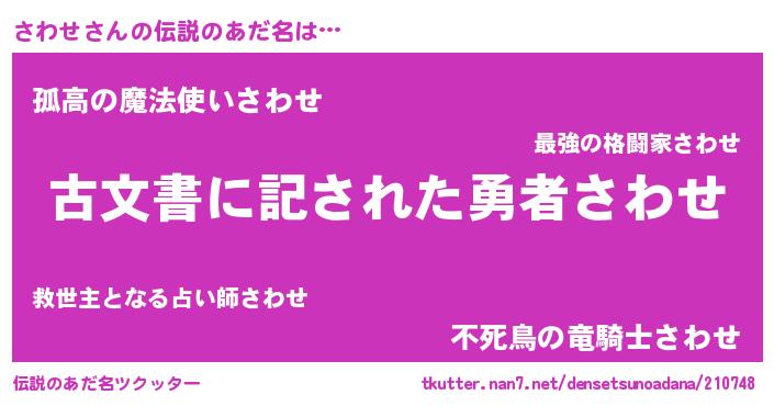 | 男性向けラノベタイトル風あだ名 | 『さわせに滅ぼされるだけの簡単なお仕事です』 |