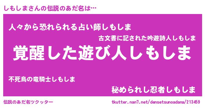 | 男性向けラノベタイトル風あだ名 | 『この素晴らしい世界にしもしまを!』 |