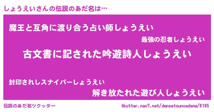 | 男性向けラノベタイトル風あだ名 | 『しょうえい~年齢イコール彼女いない歴の魔法使い~』 |