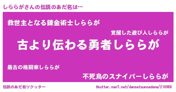 | 女子向けラノベタイトル風あだ名 | 『しららがの契約王妃』『しららが恋絵巻』 |