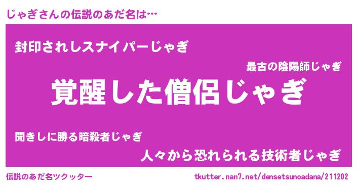 | 男性向けラノベタイトル風あだ名 | 『Re:じゃぎから始める異世界生活』 |