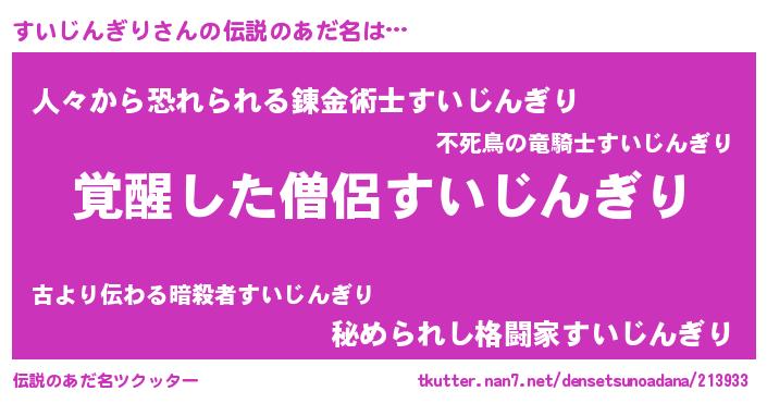 | 男性向けラノベタイトル風あだ名 | 『うちのすいじんぎりが世界を掌握している!』 |