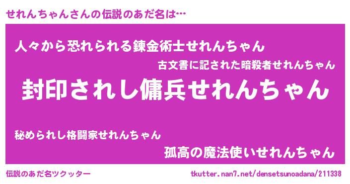 | 男性向けラノベタイトル風あだ名 | 『せれんちゃん~年齢イコール彼女いない歴の魔法使い~』 |