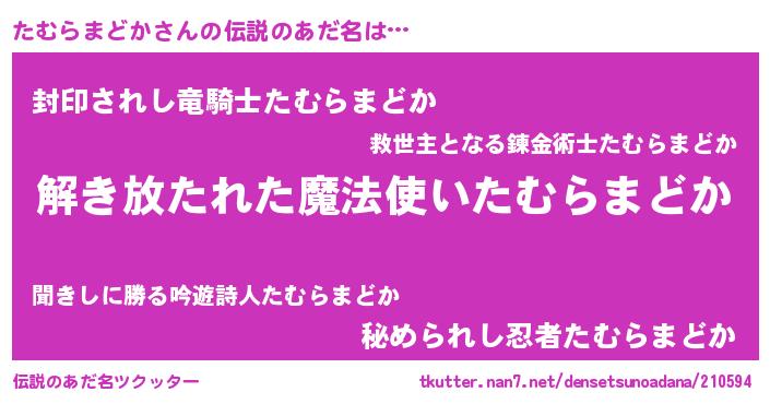 | 男性向けラノベタイトル風あだ名 | 『たむらまどかの嫁は女の子じゃないと思った?』 |