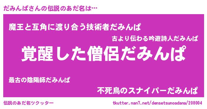 | 男性向けラノベタイトル風あだ名 | 『だみんぱ~年齢イコール彼女いない歴の魔法使い~』 |