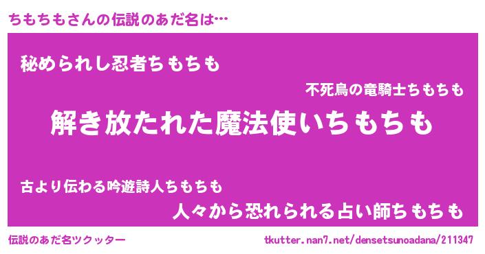 | 女子向けラノベタイトル風あだ名 | 『ちもちもの卵を拾いまして』 |