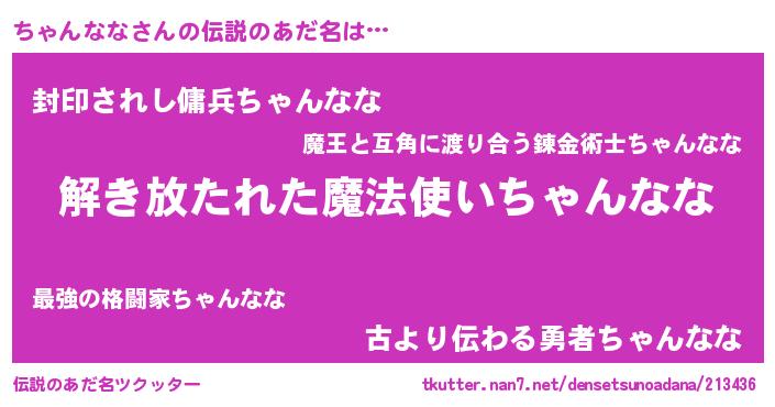 | 女子向けラノベタイトル風あだ名 | 『ちゃんななの卵を拾いまして』 |