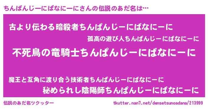 | 男性向けラノベタイトル風あだ名 | 『ちんぱんじーにばなにーにの憂鬱』 |