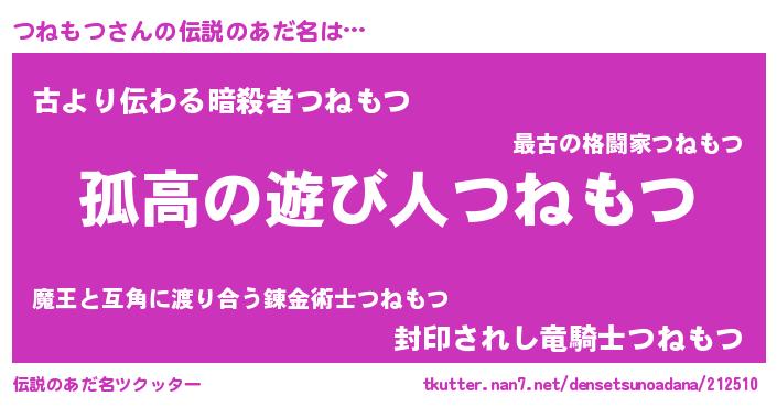 | ヒーロー風カッコイイあだ名 | 『暗黒騎士ツネ』『ネオツネモツ』 |
