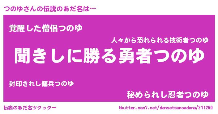 | 男性向けラノベタイトル風あだ名 | 『つのゆという概念が存在しない退屈な世界 』 |