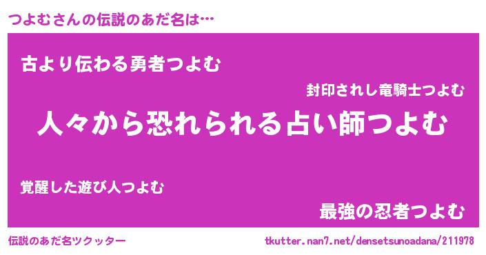 | 女子向けラノベタイトル風あだ名 | 『つよむなんてお断りですっ。』 |