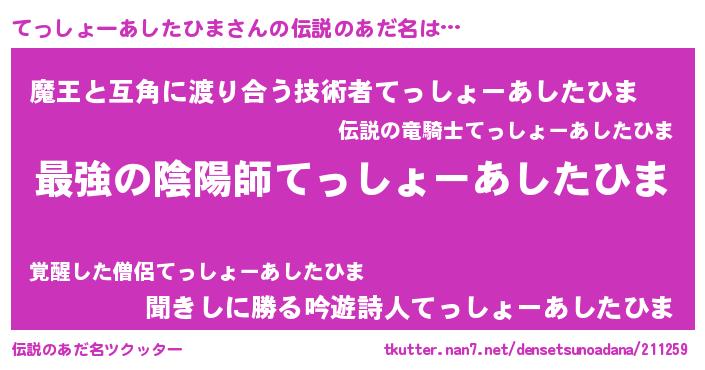 | 男性向けラノベタイトル風あだ名 | 『うちのてっしょーあしたひまが世界を掌握している!』 |