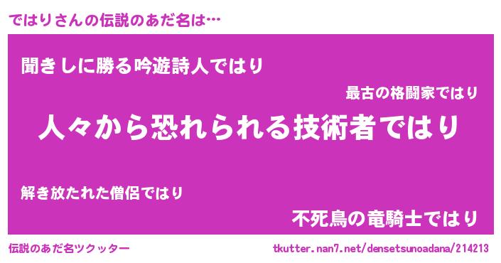 | 男性向けラノベタイトル風あだ名 | 『デハリスレイヤー』『魔弾の王とではり』 |