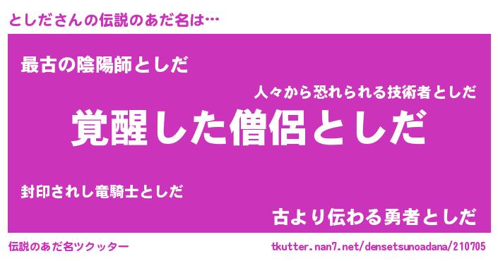 | 男性向けラノベタイトル風あだ名 | 『としだの嫁は女の子じゃないと思った?』 |
