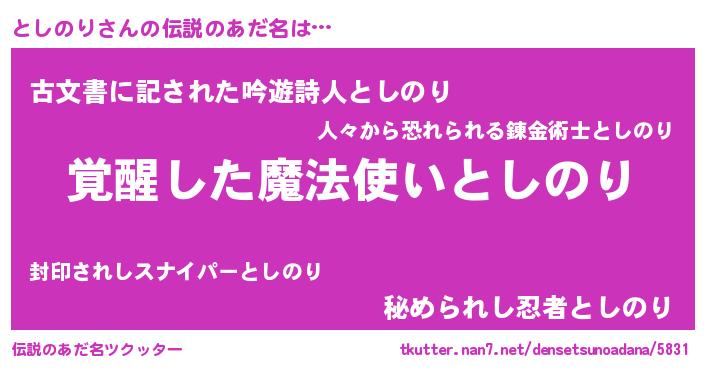 | 意味不明あだ名 | 『自称としのり』『永久保存としのり』 |