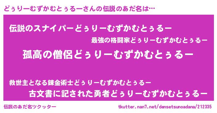 | 男性向けラノベタイトル風あだ名 | 『ダンジョンにどぅりーむずかむとぅるーを求めるのは間違っているだろうか』 |