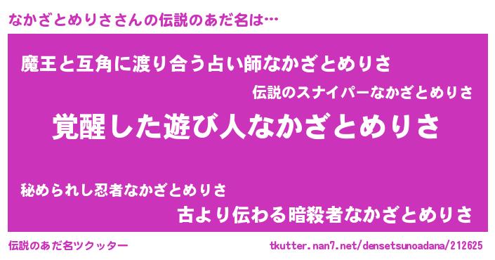 | 男性向けラノベタイトル風あだ名 | 『なかざとめりさの嫁は女の子じゃないと思った?』 |